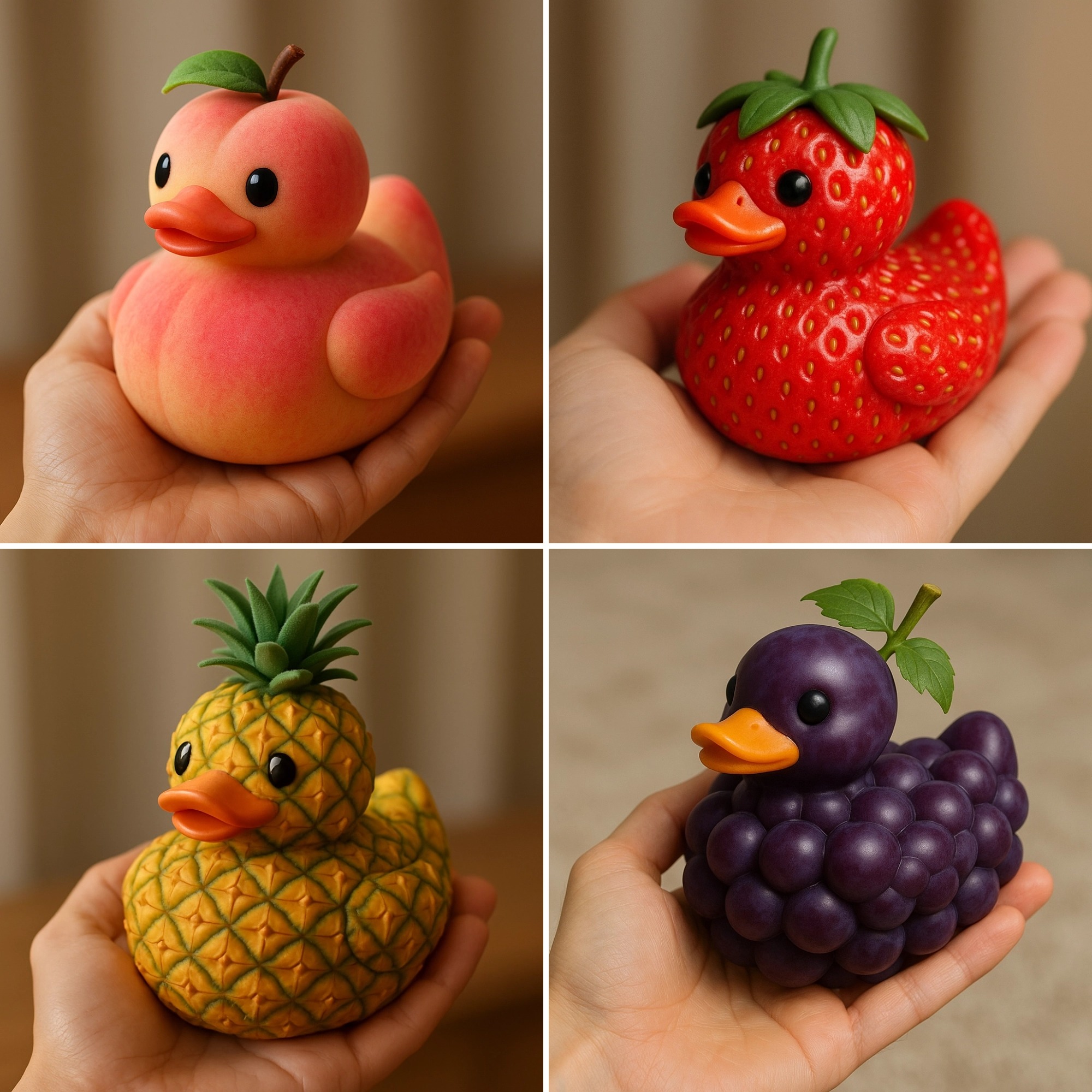 🍓🍍🍑 Add a delightful splash of color and playful charm to any space with our Whimsical Fruit-Themed Duck Figurines! These enchanting little ducks cleverly combine the beloved classic rubber duck silhouette with the vibrant appearance of your favorite fruits, creating a truly unique and irresistible decorative accent.
