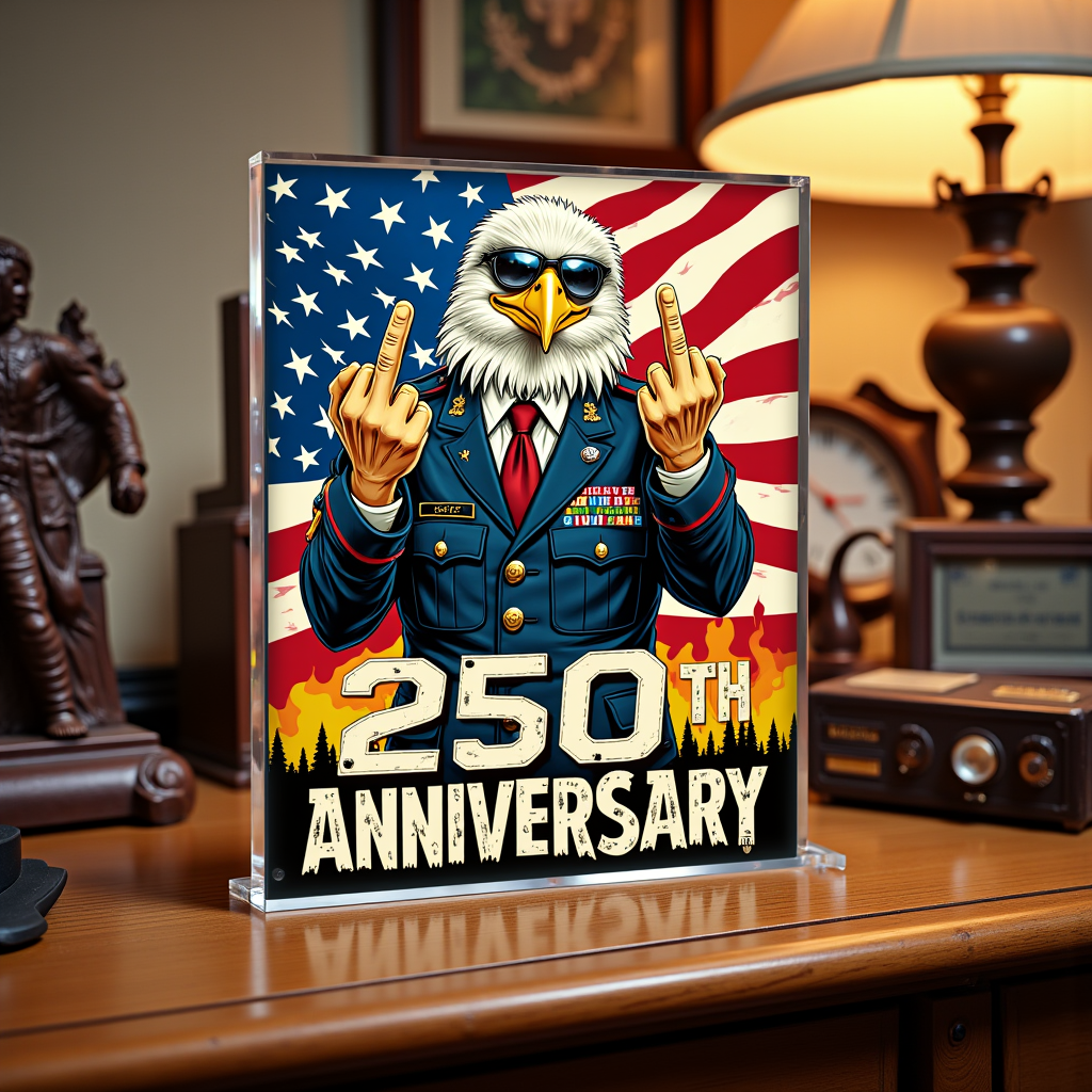 Unique Design:Features a bold, cartoonish eagle in military attire making a gesture, paired with the American flag, creating a striking and unconventional look.