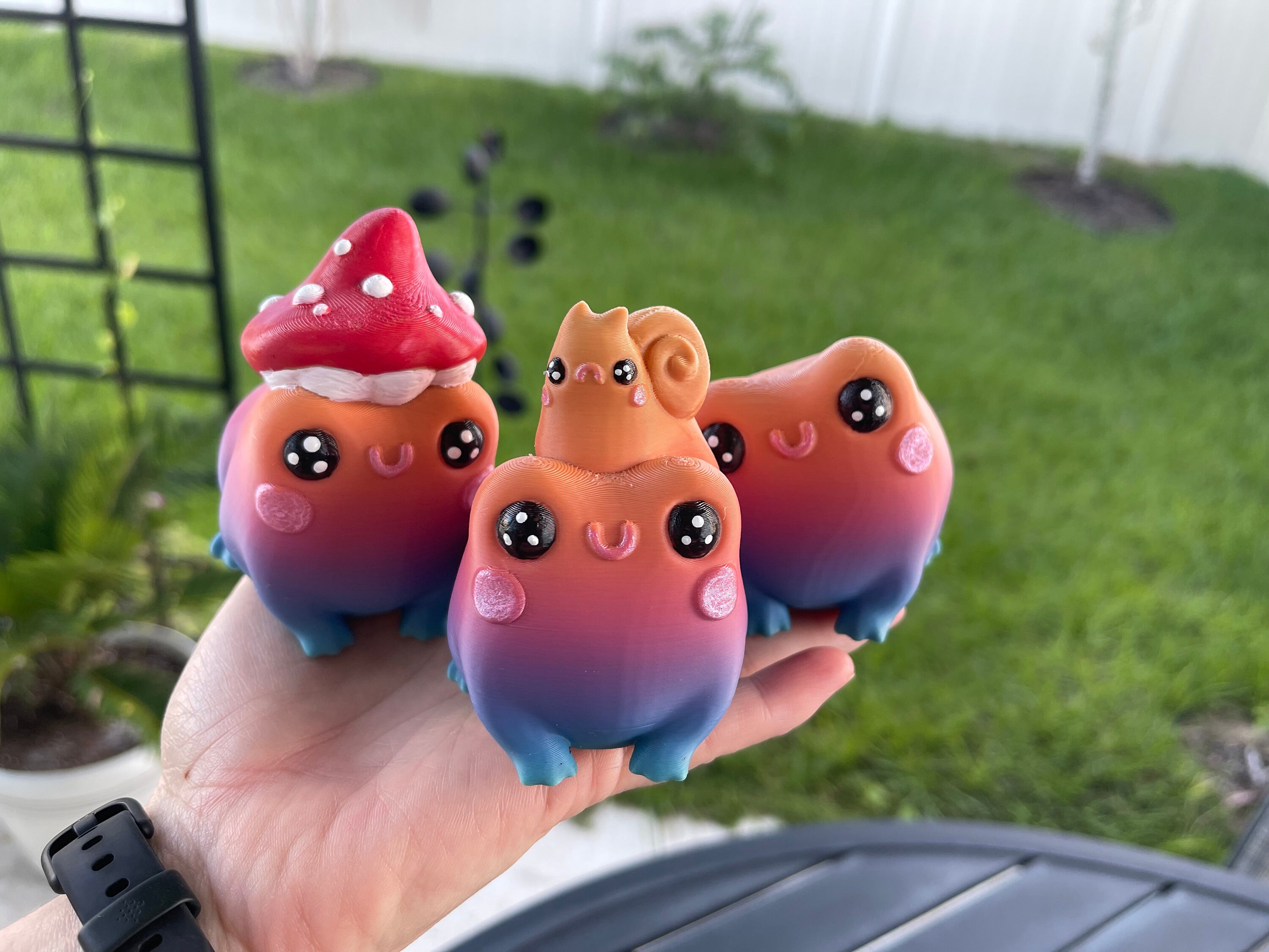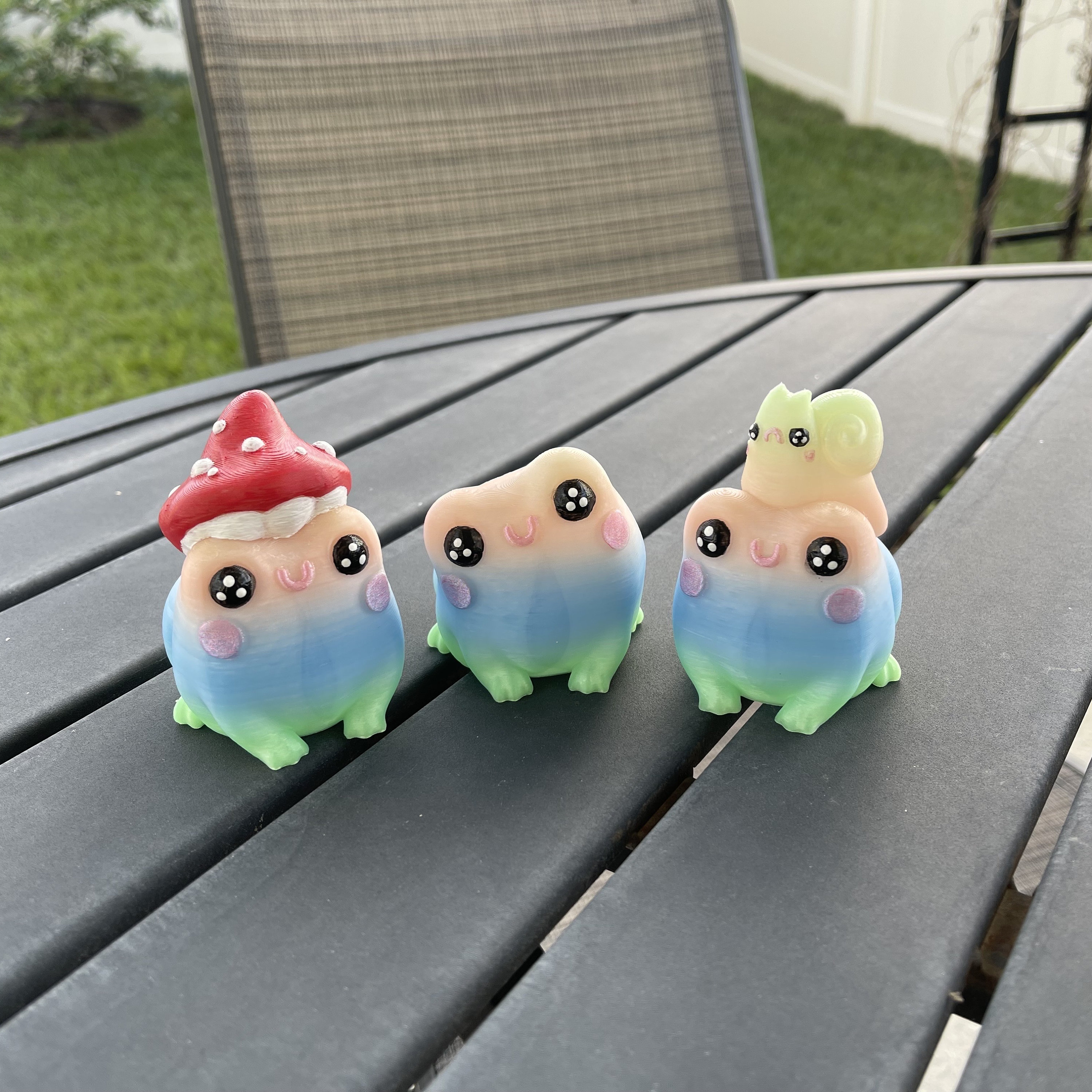 ✨Cute 3D Print Butt Frogs,one has a tilted head, one has a mushroom hat and the other a snail. All 3 are hand painted.