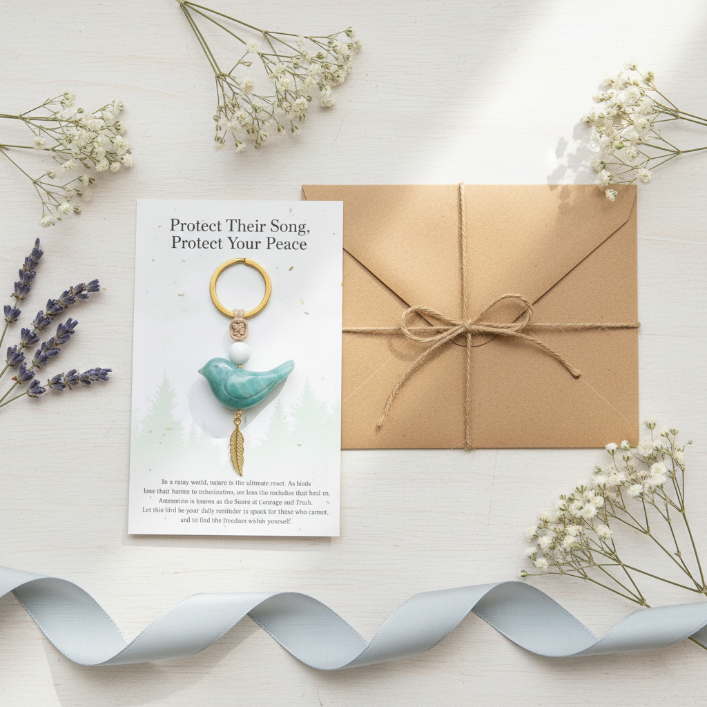 Inspired by the simple joy of bird songs in a quiet forest, this piece combines the soothing energy of natural gemstones with a meaningful message: Protect their song, protect your peace.