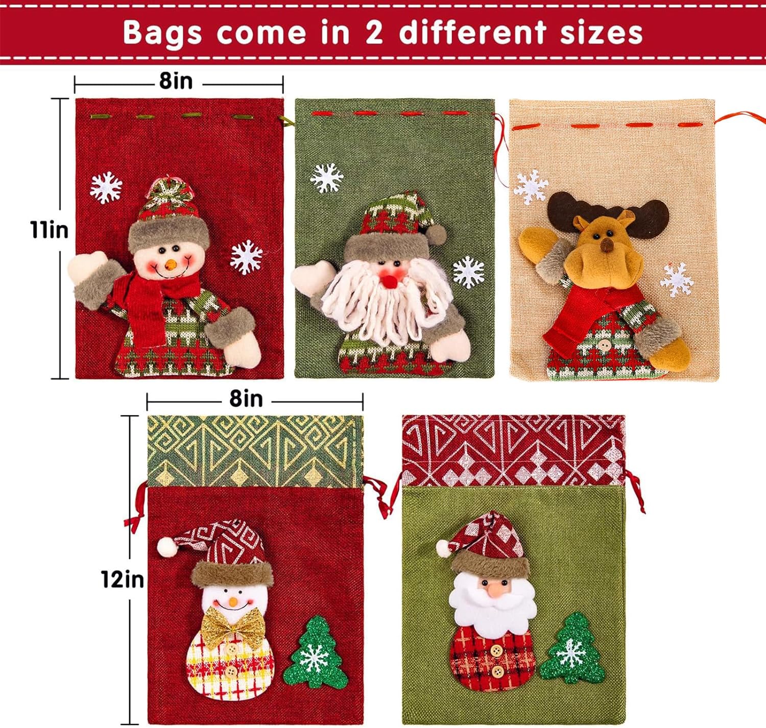 Christmas candy bags come with drawstrings which make the bags easy to open and close and avoid objects lost. The string loop functions as a bag handle as well, easy to take out.