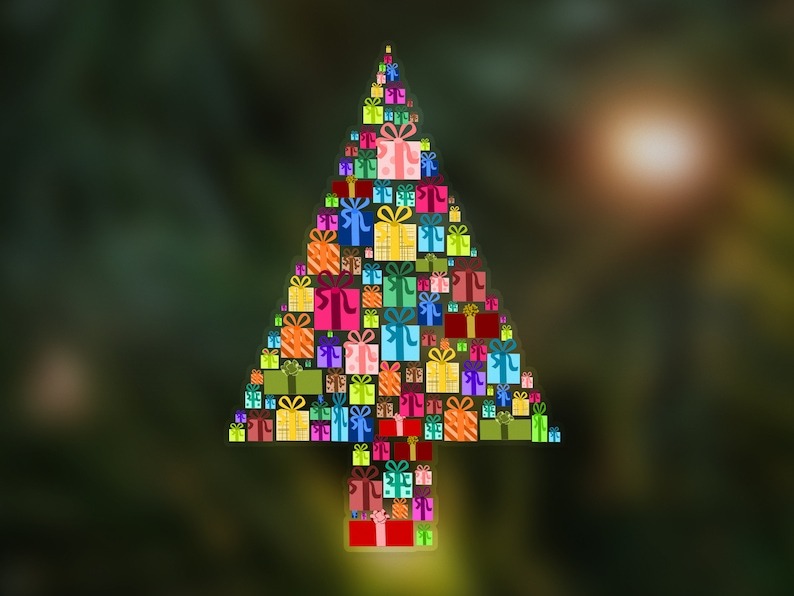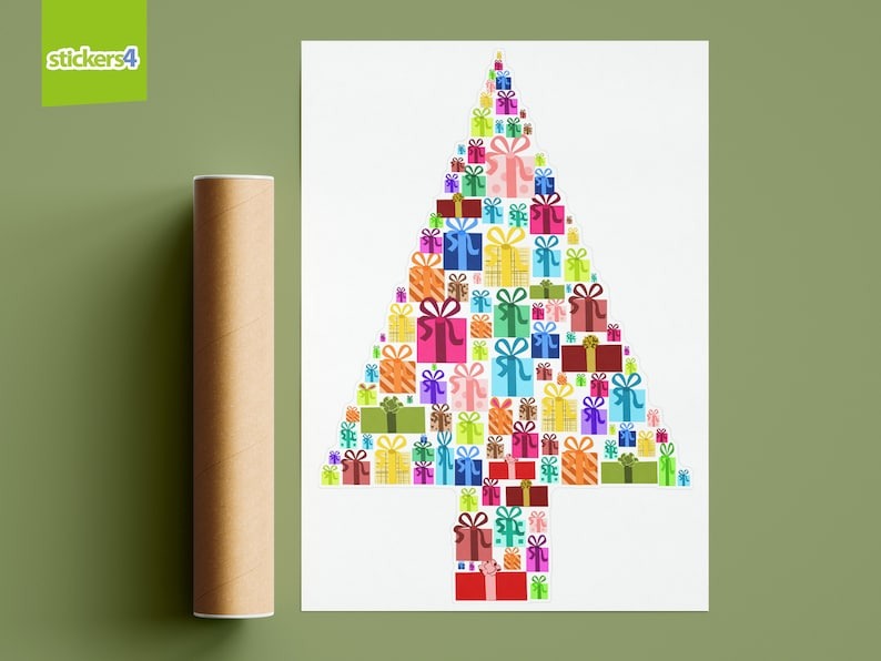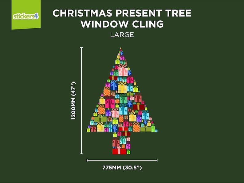 A beautiful full color Christmas tree consisting of Christmas gifts printed on vinyl that is easy to stick and reuse! It is printed in vibrant full color, available in a variety of sizes, and can be affixed to the inside of a window.