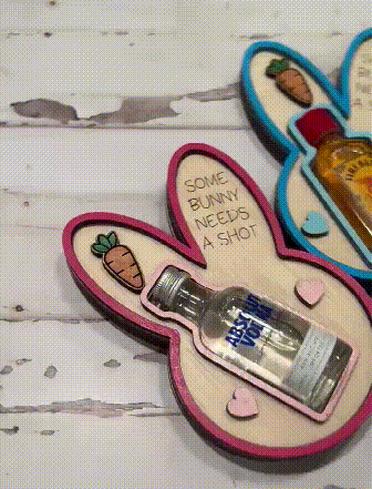 Crafted from wood and bursting with personality. Made from 5 layers of 3mm wood, this bunny measures approximately 8" x 4" with about 1 inch of depth. The standard size fits most popular bottles—Jack Daniels, Jim Beam, Captain Morgan, Jose Cuervo, and all those classic favorites. Just pop in your bottle of choice (alcohol not included—you bring the spirits!) and watch this bunny become the life of the Easter party.