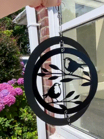 Bring your garden to life with a gentle, mesmerizing spin. This beautifully crafted hanging ornament features two birds resting on branches, surrounded by a rotating frame that catches the breeze and turns it into a calming visual display.