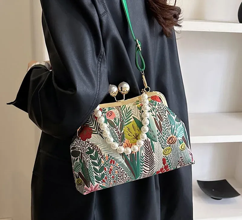 Pearl handheld. The bag comes with beautiful pearl handles that add a touch of luxury and elegance to the overall design. The exquisite smooth pearl handle ensures a comfortable grip when carrying.