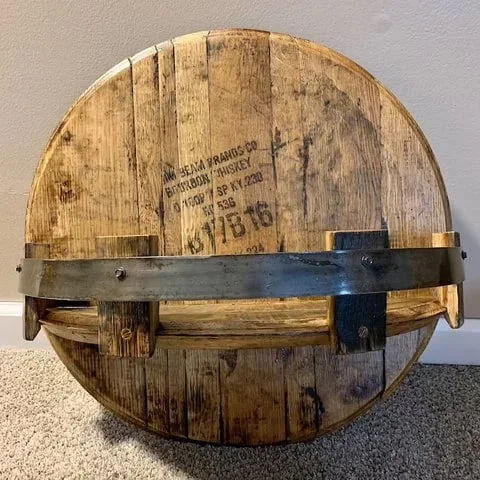 Display your bourbon or whiskey collection on this shelf made entirely from whisky bourbon barrel heads, staves and the metal bands that are used to secure bourbon barrels.